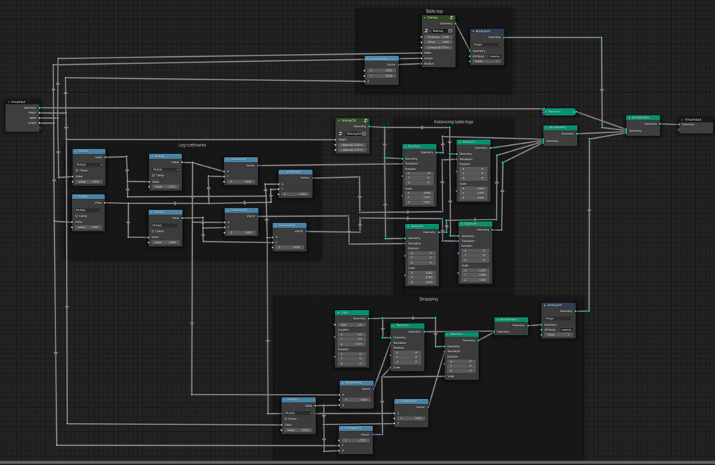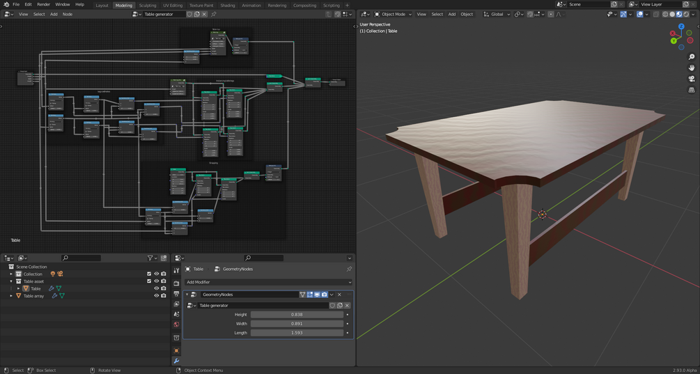 This is generator of a simple table. It illustrates how things work in Geometry nodes editor. To use this you have to install Blender no less than 2.93 version. The Geometry nodes is still missing many nodes so in the future process of creating such generators should be improved segnigicantly. The file also has illustration of using primitive nodes as array modifiers.